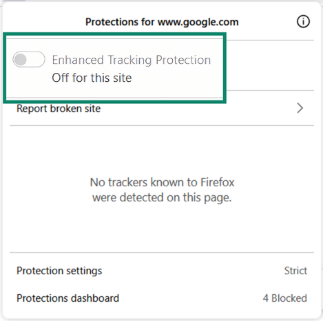 - Toggle ETP off. This will add the site to your exceptions list, which will allow essential trackers and fix the site’s functionality.