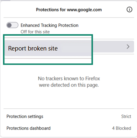 - Report the site to Firefox. You can do this by clicking the shield icon or by opening the menu panel and then clicking on “Report broken site.”