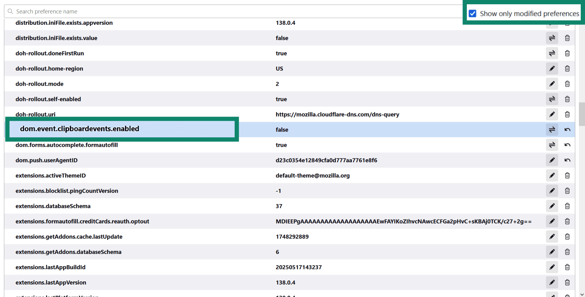 | network.dns.disablePrefetch | TRUE | Medium | Slightly slower browsing |