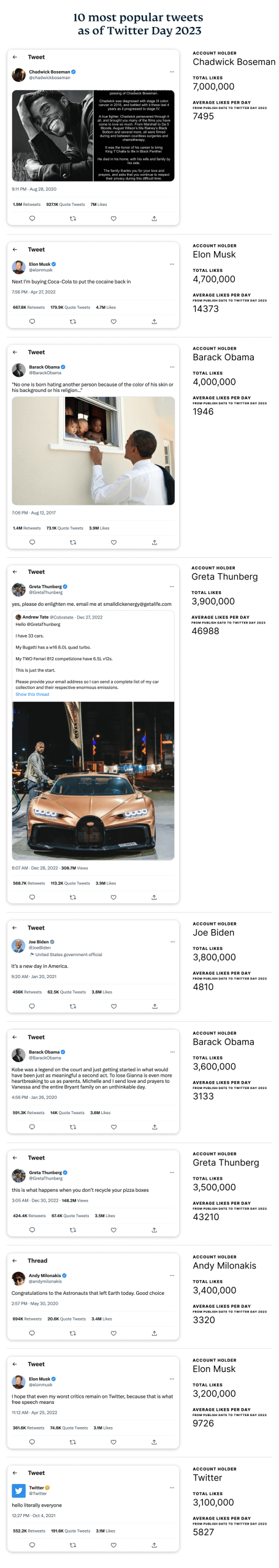 • A post announcing the passing of Chadwick Boseman by the actor's family remains the most-liked tweet ahead of Twitter Day 2023
