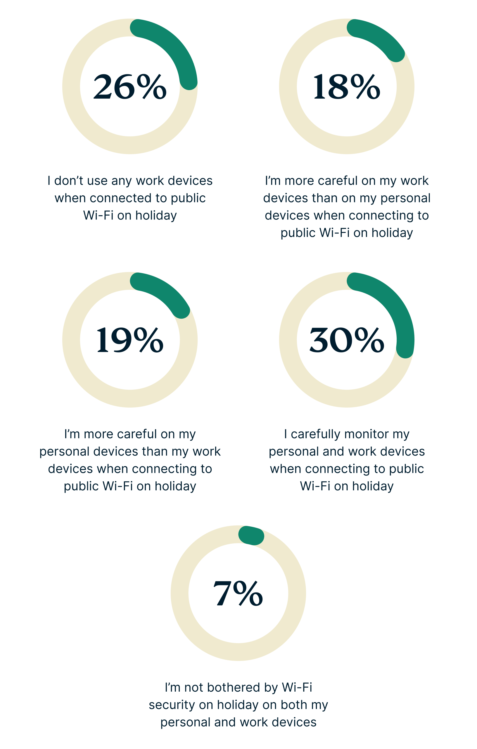 Although it's reassuring that 30% of travelers take extra security measures with their devices on public Wi-Fi, such as careful location selection or using VPNs, the fact that 7% disregard Wi-Fi security on both personal and work devices is alarming.