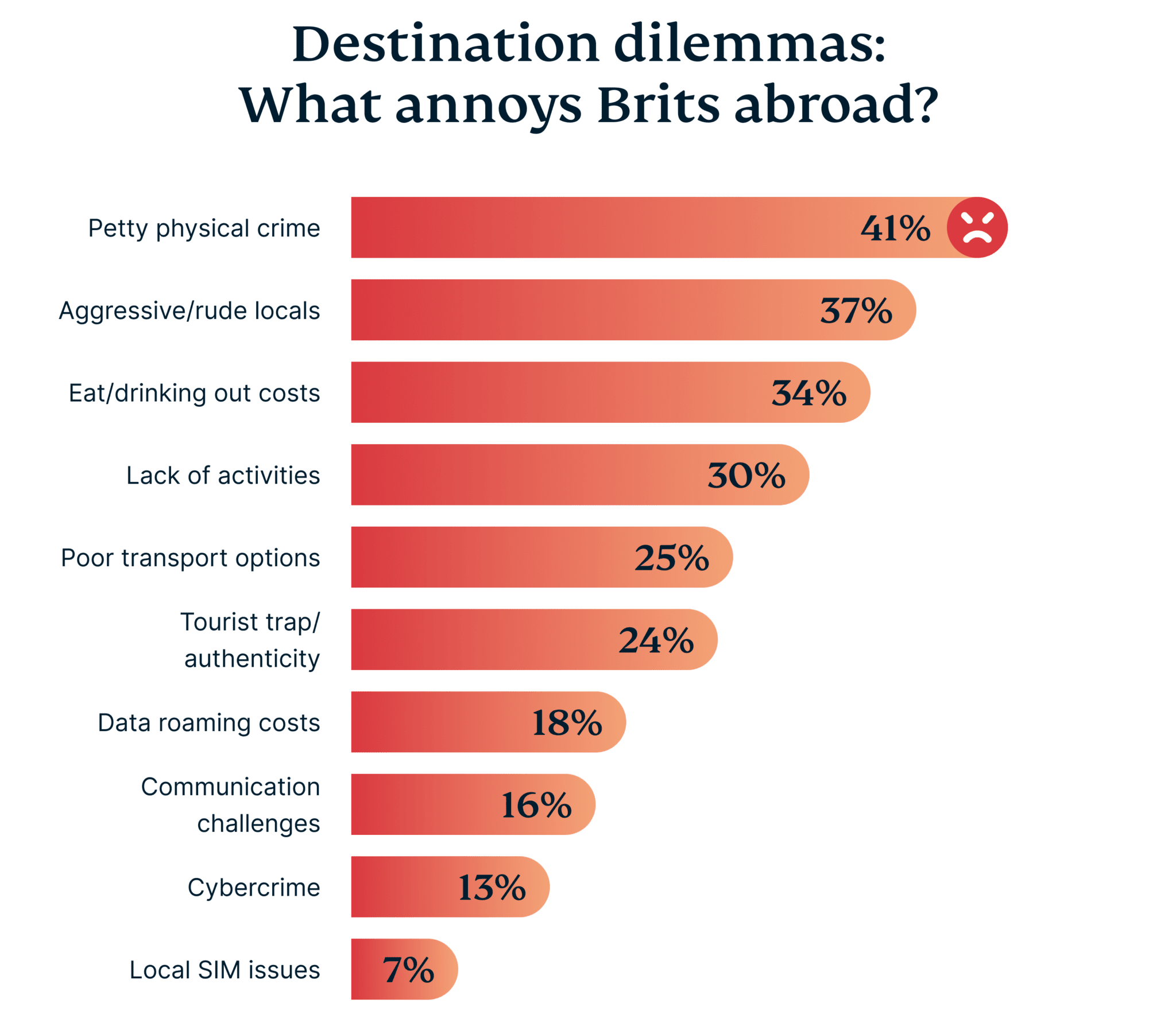 Despite the exciting prospect of getting to explore new destinations, more annoyances await. According to our respondents, top concerns about the holiday destination itself include the physical security of the area, with 41% of travelers wary of pickpockets and antisocial behavior. Close behind are frustrations with local hospitality, where 37% find locals’ behavior towards tourists less than welcoming. The cost of dining out annoys 34%, highlighting the price sensitivity that extends beyond just booking the trip.