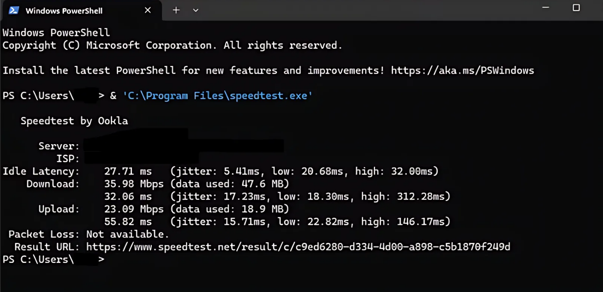 2. Run baseline test: Open a command prompt or PowerShell window (type PowerShell or command prompt in your Windows search bar to bring these options up). Then, run the speedtest command (e.g., speedtest) while disconnected from the VPN.Command prompt: "C:Program Filesspeedtest.exe"