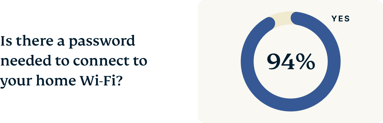 Our survey results reveal that a significant majority (94%) of respondents use passwords to protect their home Wi-Fi networks, which aligns with the common practice of setting up passwords during router installation. Furthermore, 31% of respondents admit to updating their passwords regularly. While this practice isn't necessary if you have a strong password saved in a password manager, it can prevent past Wi-Fi users from retaining access.