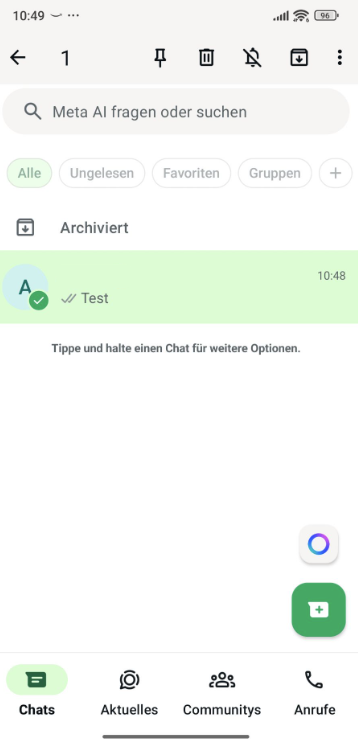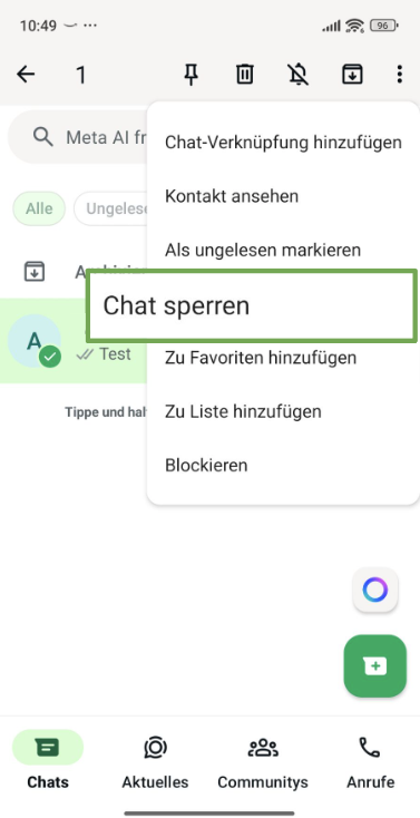 - Gehe zum Tab Chats und tippe so lange auf den Chat, den du sperren möchtest, bis ein grünes Häkchen erscheint.