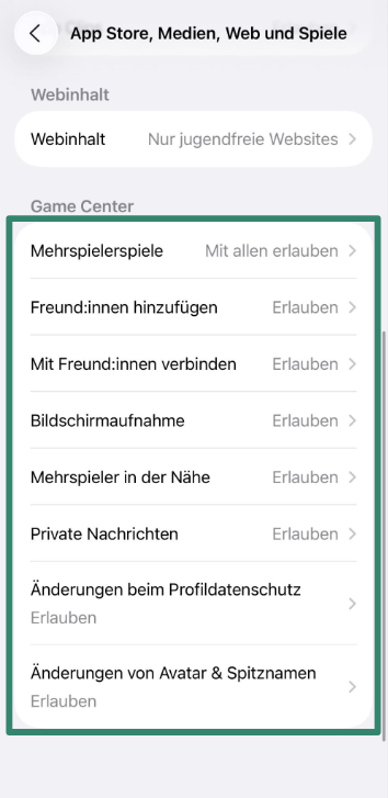 Sie können den Zugriff auf bestimmte Spielfunktionen wie Multiplayer, das Hinzufügen von Freunden oder das Versenden von Nachrichten durch Game-Center-Einschränkungen limitieren.
