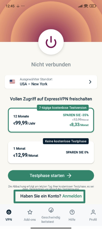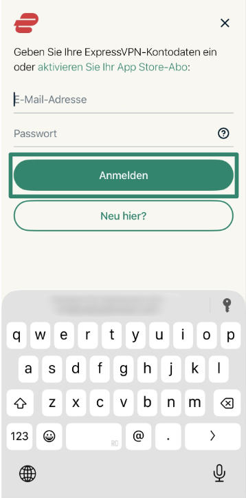 - Starte ExpressVPN und tippe auf die Schaltfläche „Anmelden", um Dich mit Deinen Zugangsdaten bei der App anzumelden.