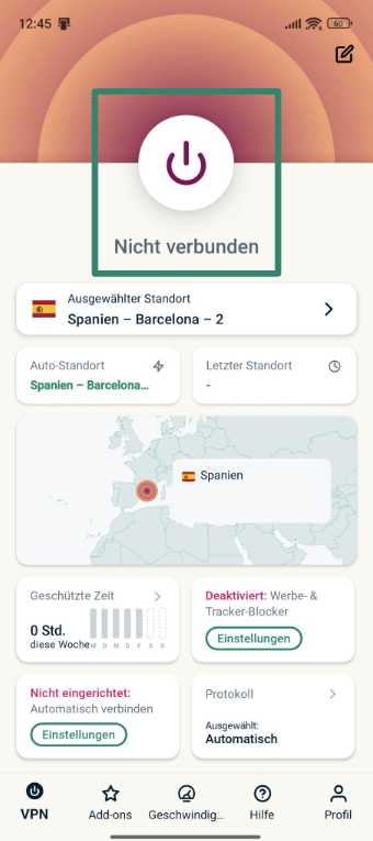 - Tippe auf die Schaltfläche „Schnell verbinden", um eine Verbindung zu einem Server herzustellen und Deine IP-Adresse zu verbergen.