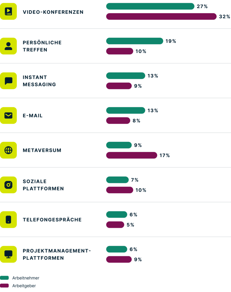 • Wer interessiert sich dafür? 77 % der Arbeitgeber bekundeten ihr Interesse an immersiven Arbeitsumgebungen wie dem Metaversum, verglichen mit nur 57 % der Arbeitnehmer. (Springen Sie zu diesem Bereich.)