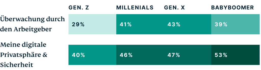 Die Generation Z war auch am wenigsten über die Überwachung durch den Arbeitgeber, die digitale Privatsphäre und die Sicherheit im Metaversum besorgt.