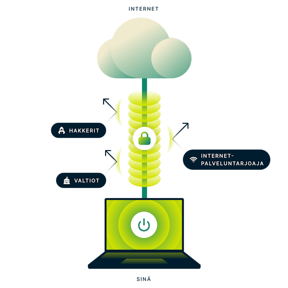 VPN eli virtuaalinen erillisverkko on suojatunneli sinun ja internetin välillä. VPN suojaa verkkoliikennettäsi nuuskinnalta, häiriöiltä ja rajoituksilta.
