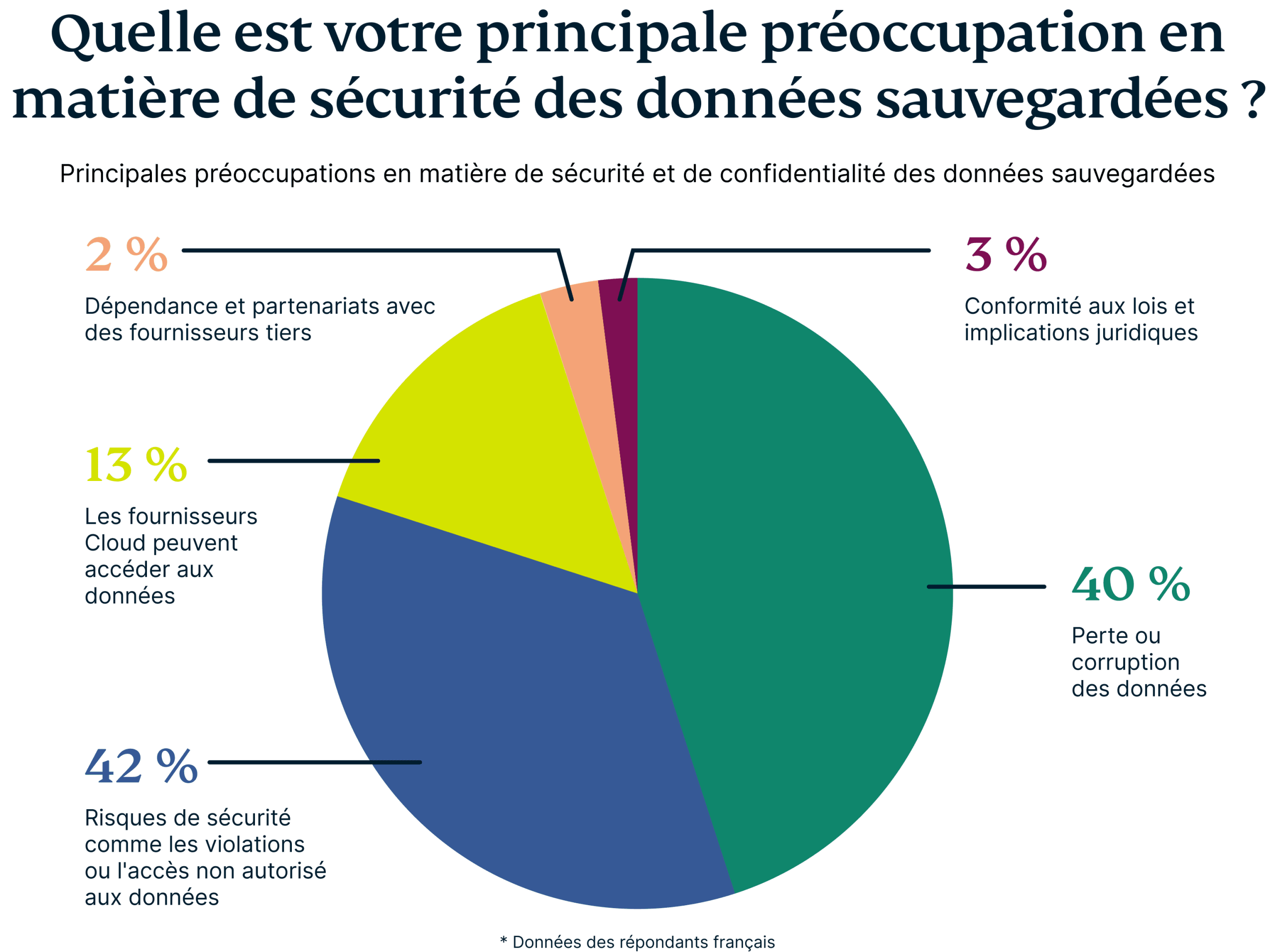 93 % des répondants français sont préoccupés par la sécurité et la confidentialité de leurs données sauvegardées. Ces préoccupations sont multiples : majeures pour 32 %, modérées pour 36 % et mineures pour 25 %. Seuls 6 % ne prennent pas en considération les dangers auxquels leurs données sont exposées. 1 % ne se disent pas préoccupés par la sécurité des données qu'ils sauvegardent.