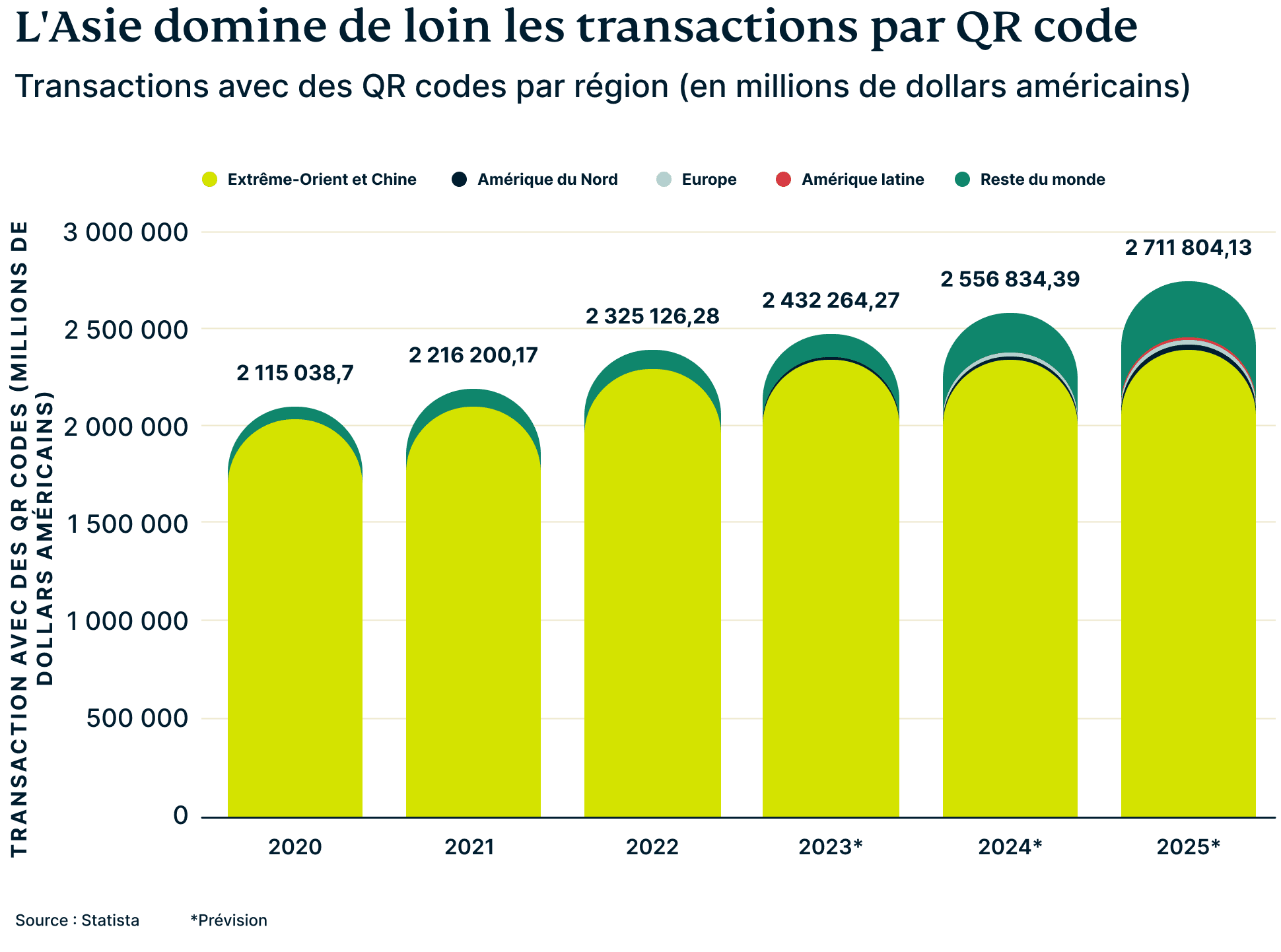 Cependant, les QR codes sont surtout utilisés pour le paiement en ligne. En Chine, les transactions Scan-to-pay (par QR code) ont augmenté de 26 % (en glissement annuel) depuis 2021, une statistique qui a été favorisée par la pandémie. Cette tendance se retrouve dans l'ensemble de l'Extrême-Orient.