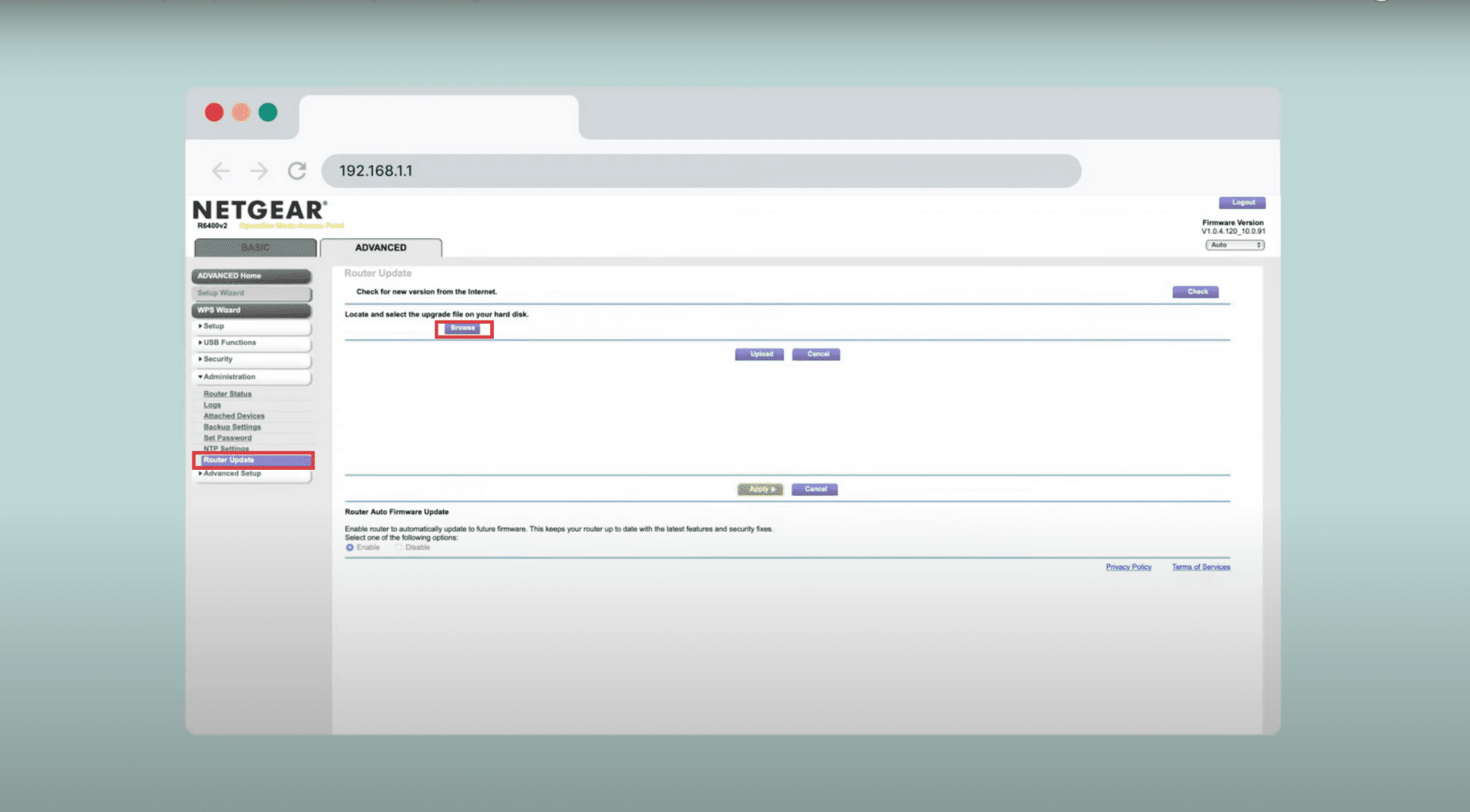 Carica il firmware fornito dal tuo provider VPN facendo clic su Browse nella dashboard di Netgear