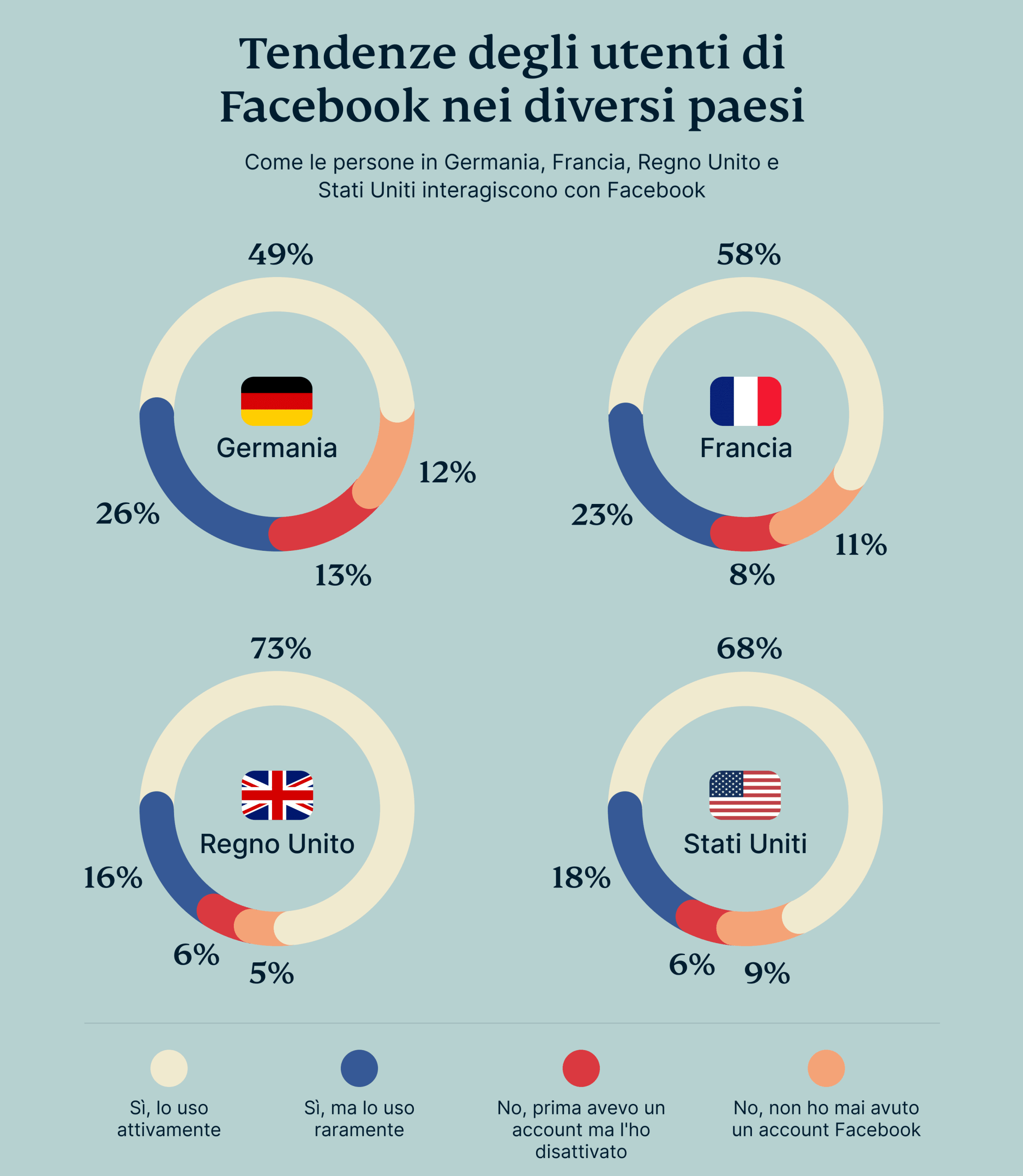 Facebook rimane un gigante globale, ma uno sguardo più approfondito rivela alcune differenze significative. Nel Regno Unito, il 73% degli intervistati dichiara di utilizzare attivamente la piattaforma. Gli Stati Uniti seguono a breve distanza, con il 68% degli utenti che accedono regolarmente. Francia e Germania, invece, sono più indietro, rispettivamente con il 58% e il 49%. Tuttavia, anche in queste regioni molti utenti stanno riducendo la loro attività. Un significativo 26% dei tedeschi e il 23% dei francesi ammettono di interagire raramente con i loro account.