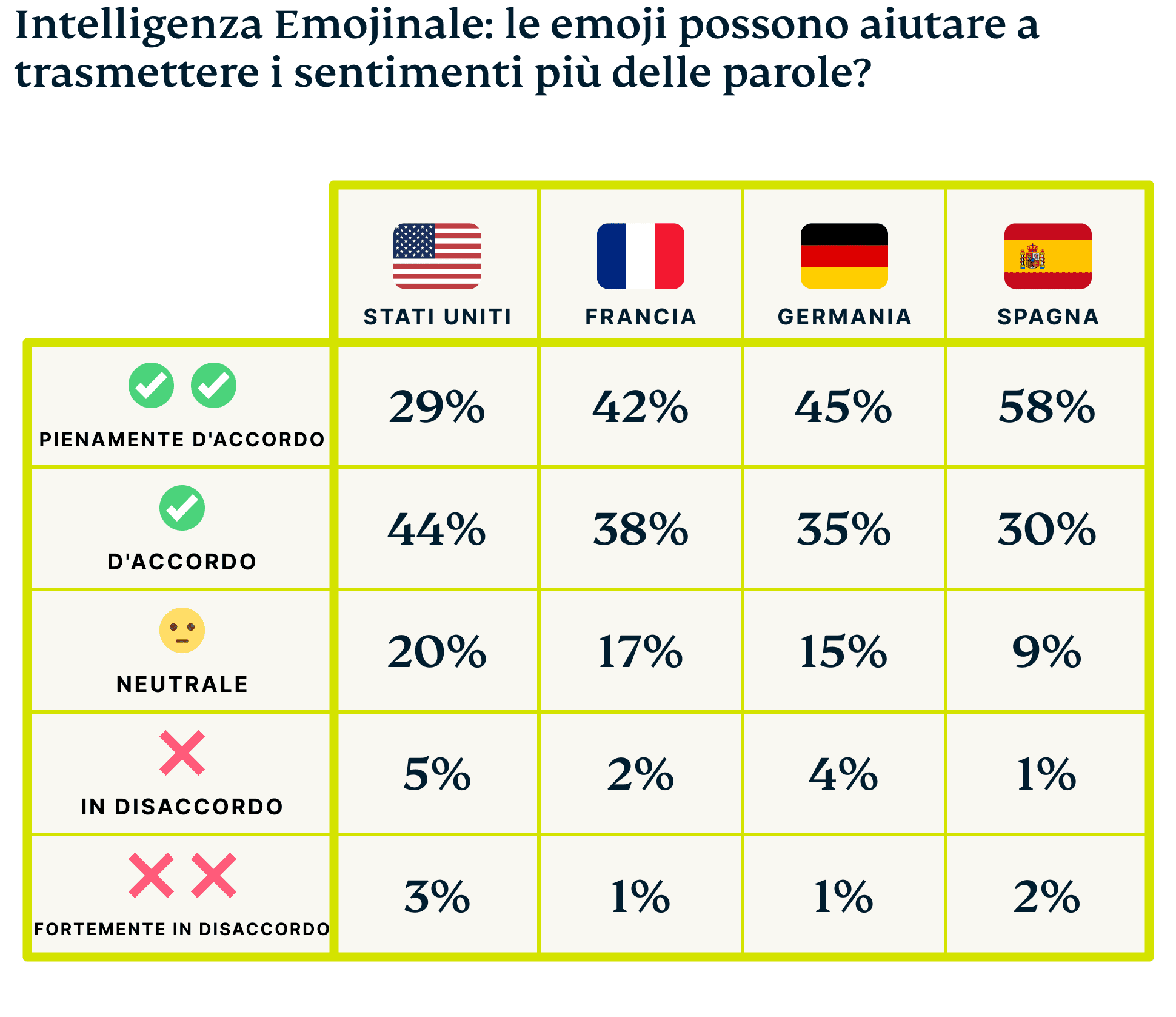 • In occasione della Giornata Mondiale delle Emoji 🌎, abbiamo condotto un sondaggio tra le persone di Francia, Germania, Spagna e Stati Uniti per capire meglio l'impatto delle emoji sulla nostra vita quotidiana.