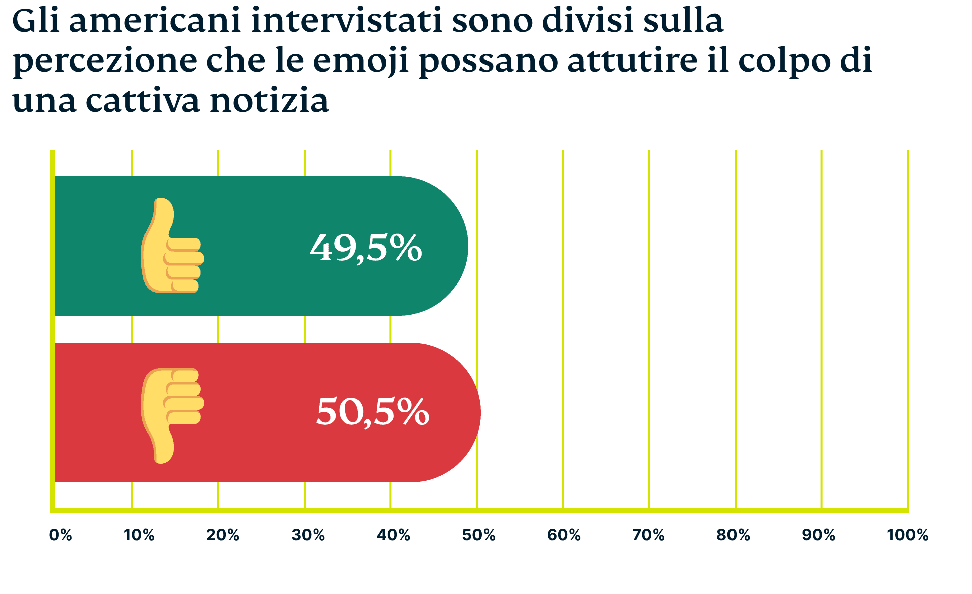 Oltre la metà (51%) degli americani intervistati ha dichiarato di non credere che le emoji attutiscano il colpo di una brutta notizia, un sentimento più diffuso che in Francia, Germania o Spagna. Tuttavia, più della metà ha dichiarato di aver usato le emoji per nascondere i propri sentimenti.