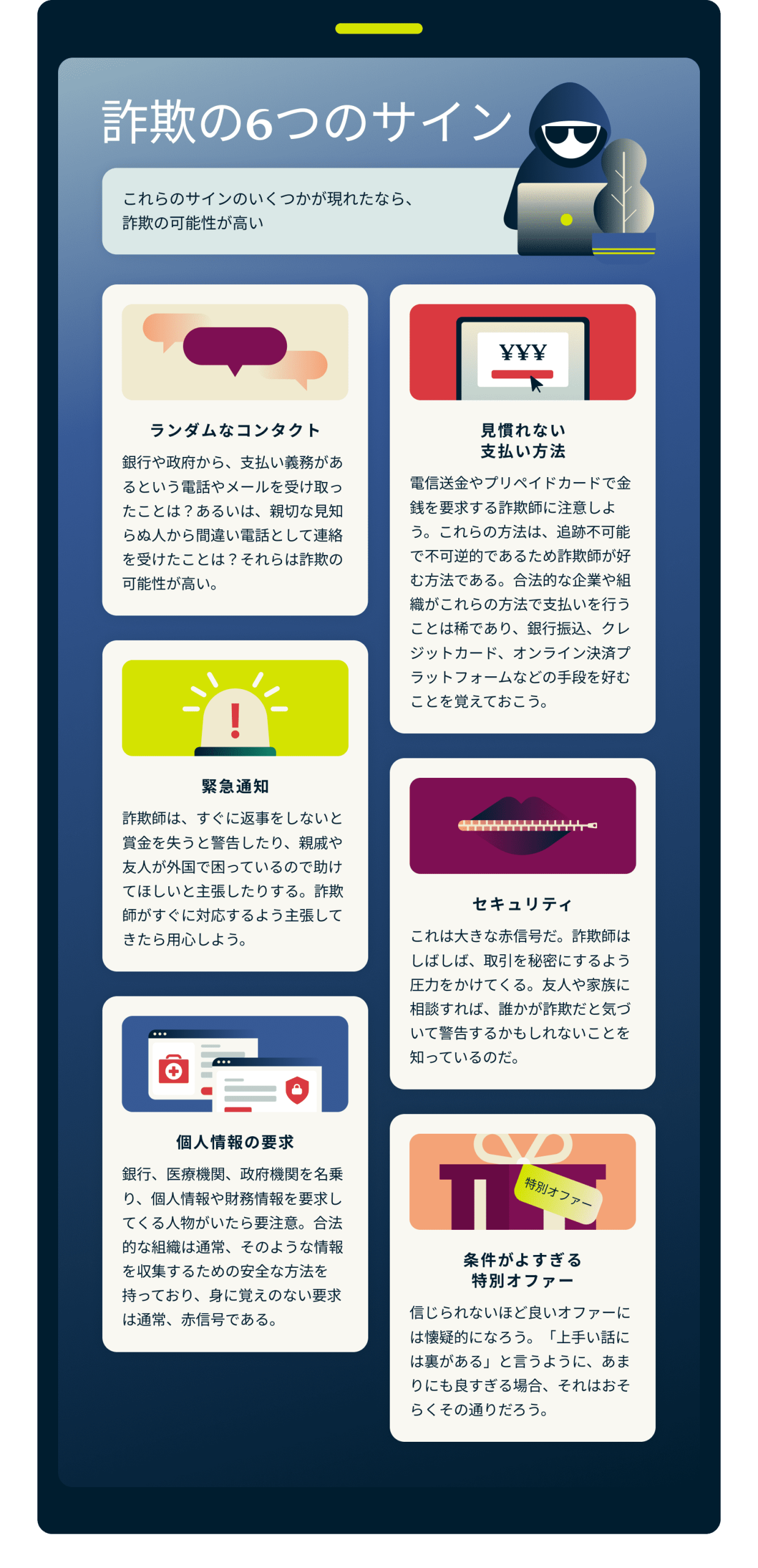 - 不審な行動を報告する:緊急性を煽るメッセージや、機密情報の提供を求めるメッセージなど詐欺のサインに注意して、不審な行動は関係当局に報告しましょう。