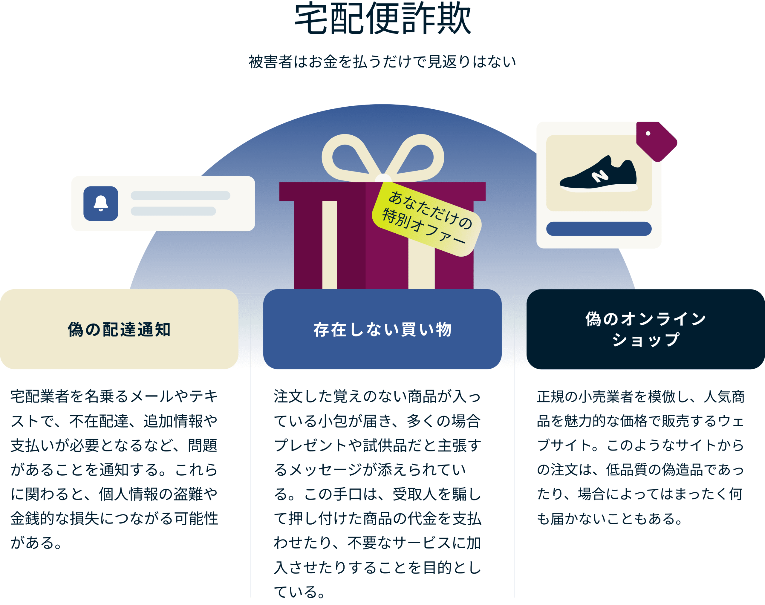 - 身に覚えのない荷物は避ける: 注文した覚えのない荷物が届いたり、未承諾の宅配料金の支払いを要求されたりした場合は注意しましょう。そのような場合は配送業者に報告し、不審なメッセージには関わらないようにしましょう。