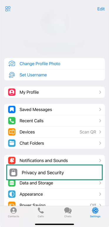 2. プライバシーとセキュリティ(Privacy and Security)をタップします。電話番号、プロフィール写真、最終オンラインステータスを誰が見られるか設定できます。全員(Everybody)を連絡先(My Contacts)に変更すると、個人情報のプライバシーが向上します。