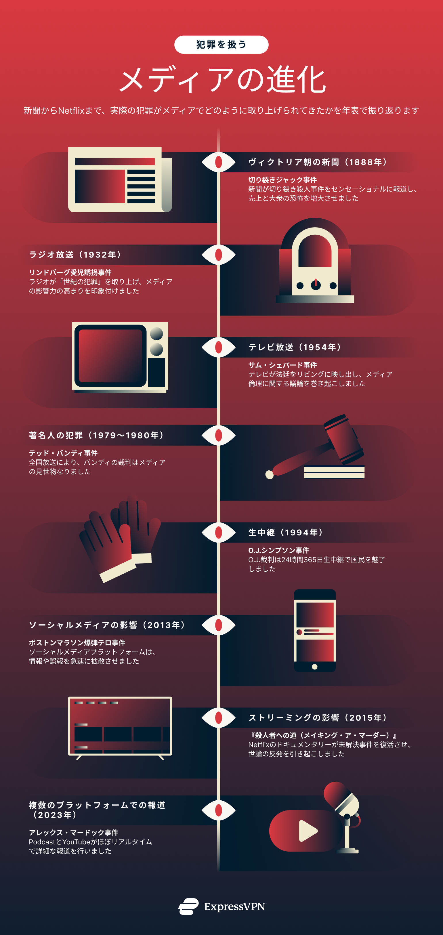 - 犯罪を扱うメディアの進化は、ヴィクトリア朝時代の新聞から現代のストリーミングプラットフォームにまで及んでいる
