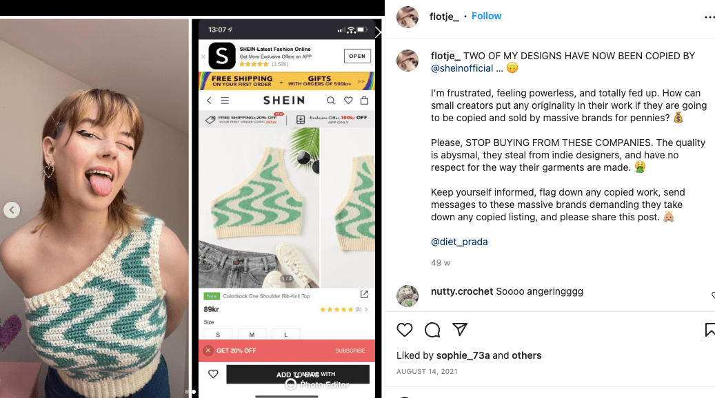 Shein is ook beschuldigd van het kopiëren van ontwerpen van onafhankelijke artiesten en kleine bedrijven. Verschillende ontwerpers hebben publiekelijk verklaard dat Shein hun originele werk heeft overgenomen en soortgelijke items in massaproductie heeft genomen zonder toestemming.