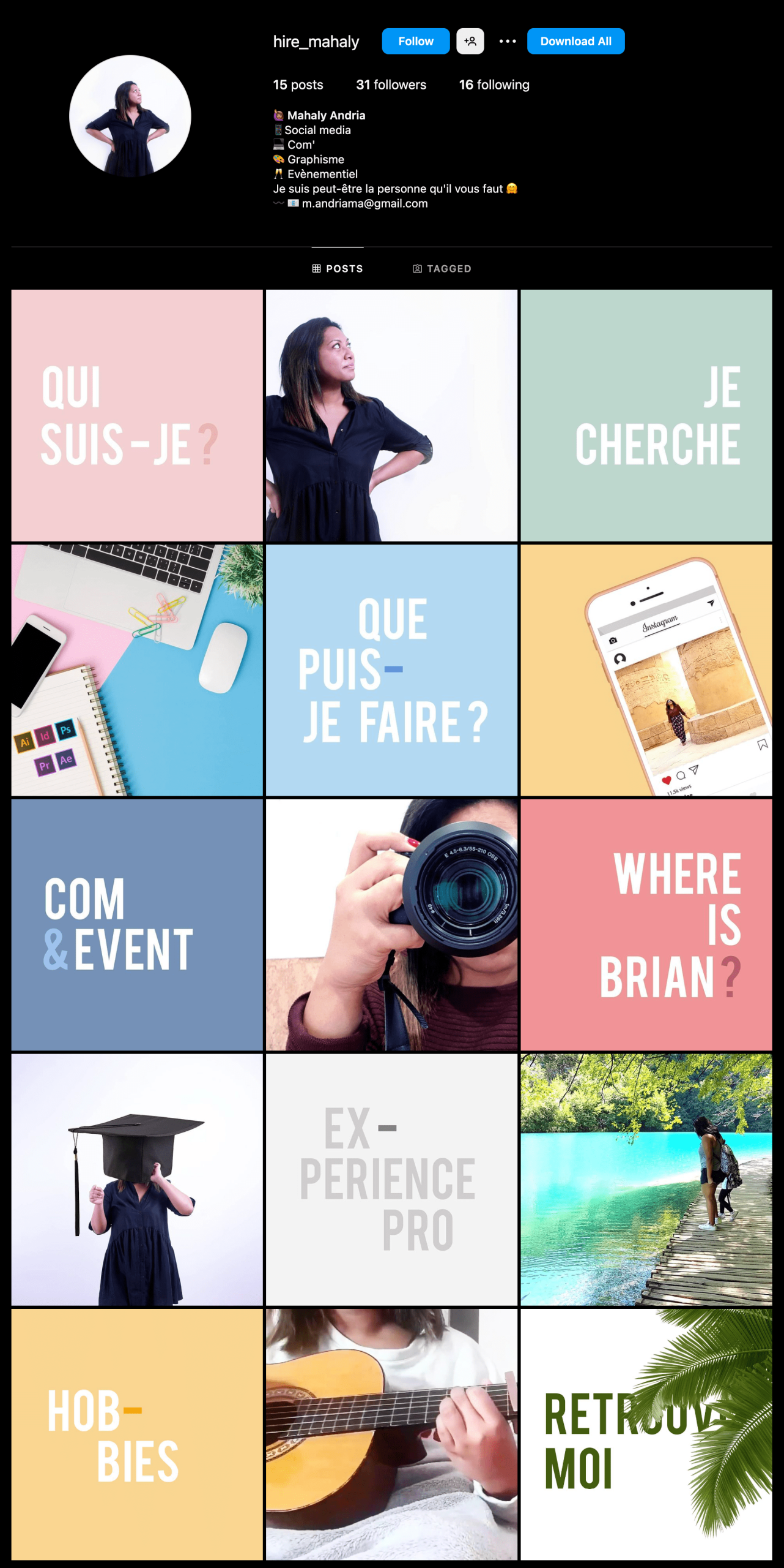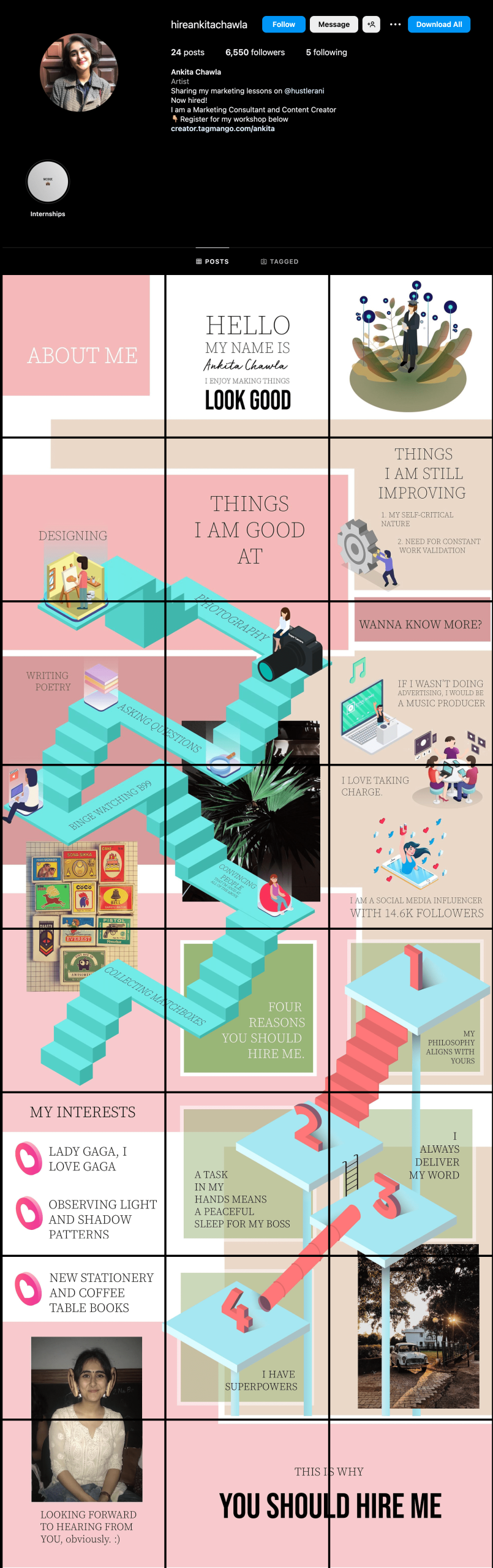 Ankita Chawla bijvoorbeeld, een gebruiker in India, heeft haar persoonlijke Instagramaccount veranderd in een creatieve etalage van haar vaardigheden en talenten. Ze heeft haar cv ontworpen in de vorm van een collage en op haar profiel gezet, en dat heeft ertoe geleid dat ze door Deloitte India is ingehuurd als "visual creator".