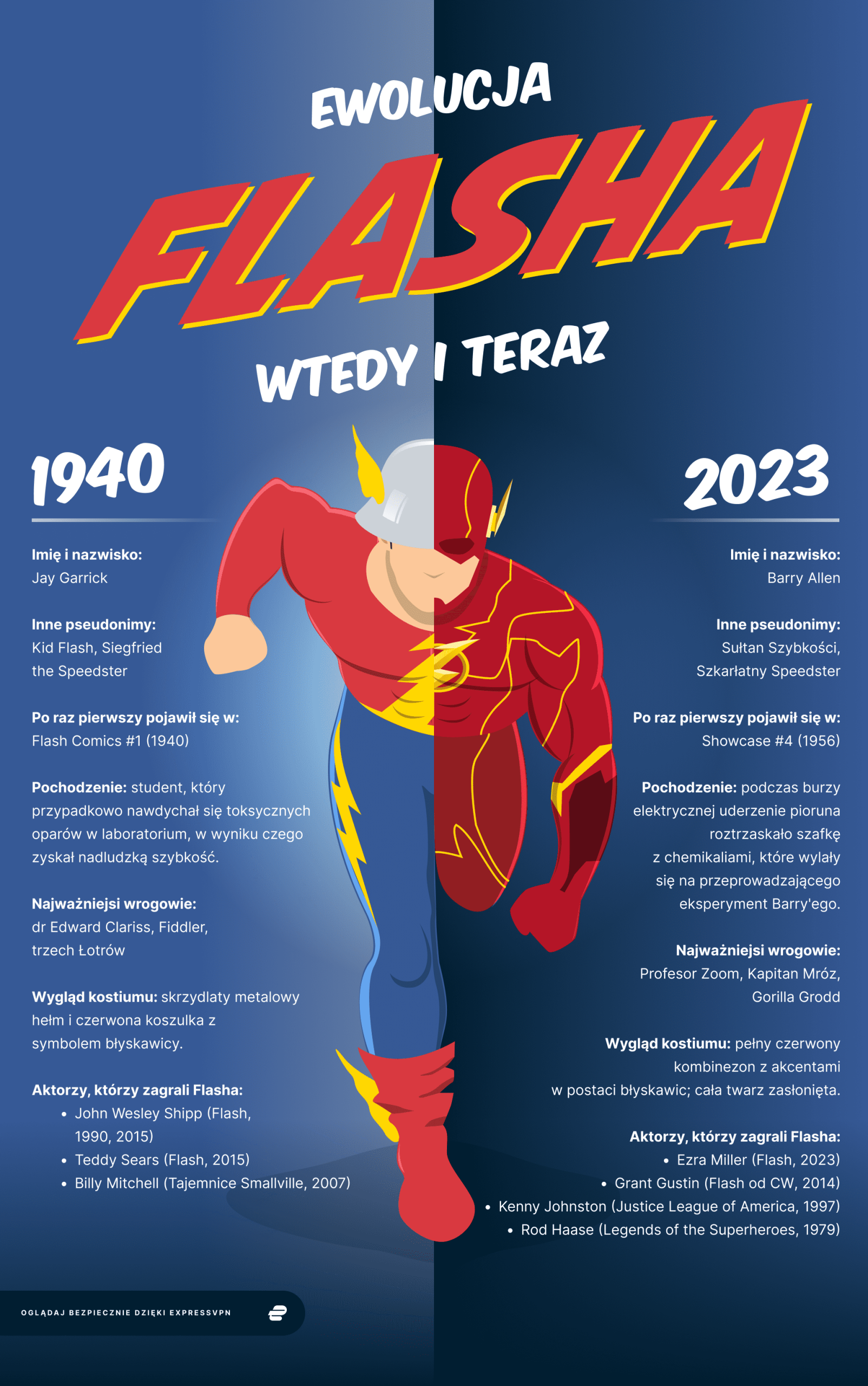 Pojawiwszy się po raz pierwszy w latach 40. ubiegłego wieku, Flash, który z gwiazdy studenckiego futbolu stał się superbohaterem, zachwycił całe pokolenia fanów komiksów. Cofnęliśmy się w czasie, by dokładnie przyjrzeć się ewolucji Flasha.
