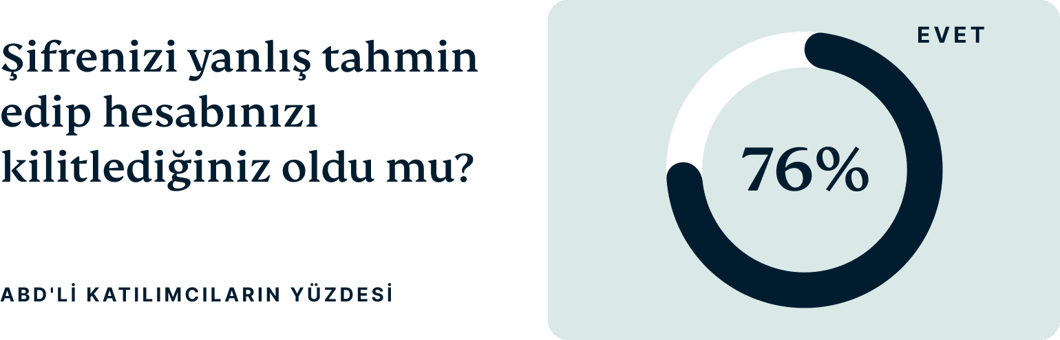 ABD’li katılımcıların %75’inden fazlası, şifrelerini yanlış girdikten sonra hesaplarının kilitlendiğini belirtti. Bu, hesaba bağlı olarak farklı şeyler anlamına geliyor: tekrar denemeden önce bir süre beklemek; sıfırlamak zorunda kalmak; şirket ile telefon veya e-posta gibi farklı yöntemler üzerinden erişmek zorunda kalmak.