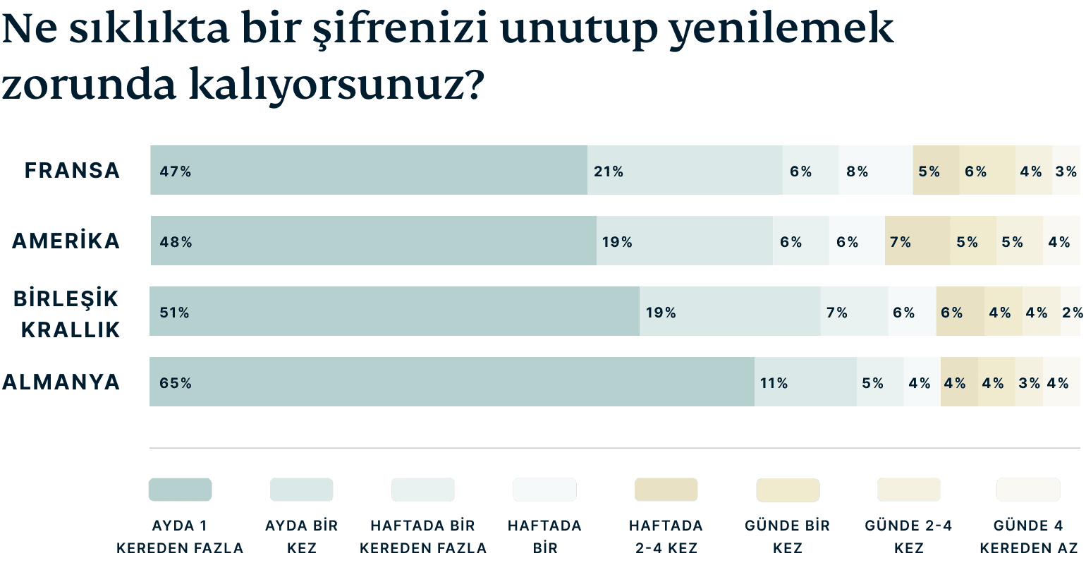 Sıklık konusu sorulduğunda, ABD’li katılımcıların %52’sinin şifrelerini ayda en az bir defa sıfırladıklarını öğrendik—bu sonuç Fransa (%53) ve Birleşik Krallık (%50) ile benzerlik gösteriyor. Ancak Almanların şifrelerini daha az sıklıkta unuttukları ortaya çıktı ve yalnızca %35’i şifrelerini ayda en az bir defa sıfırladıklarını belirtti.